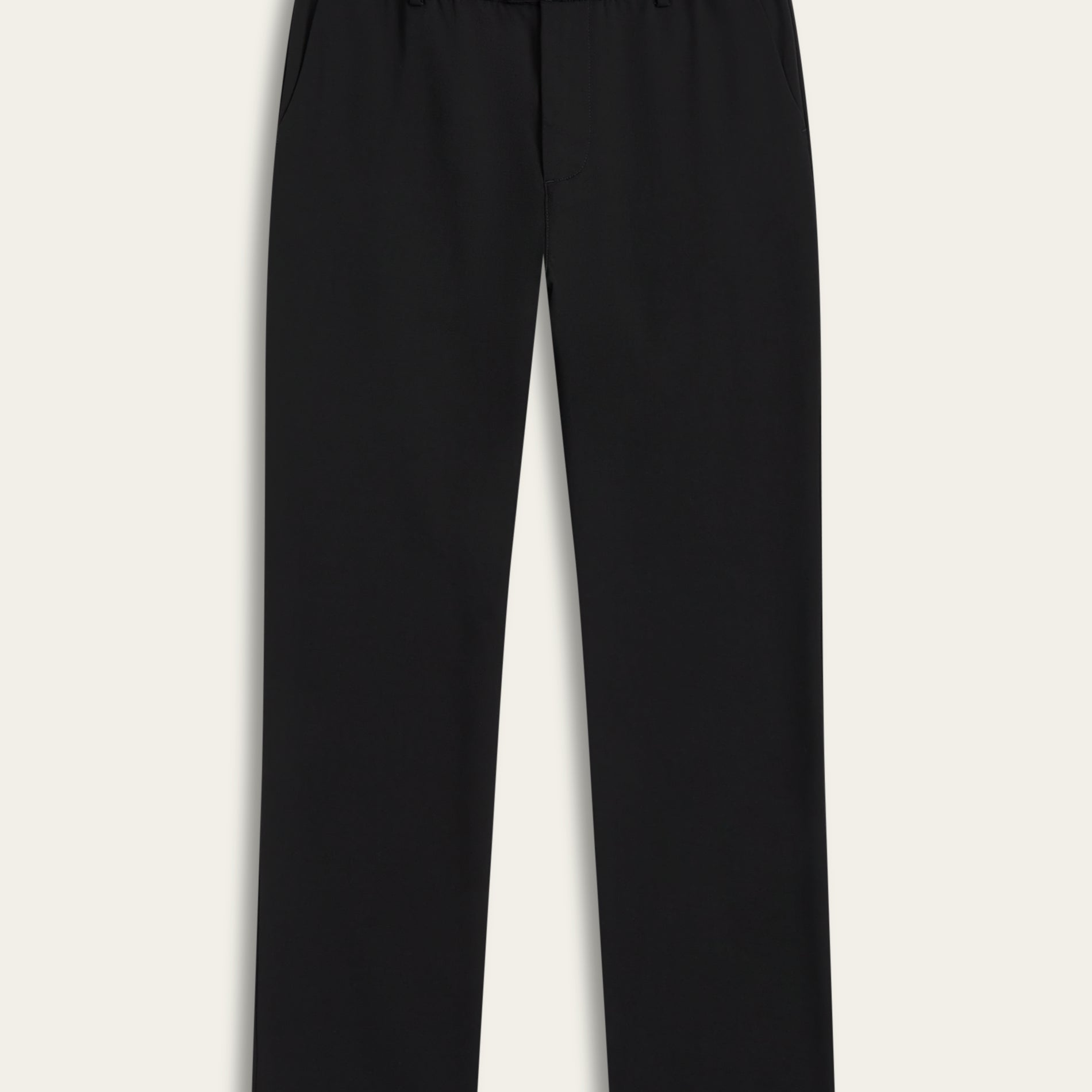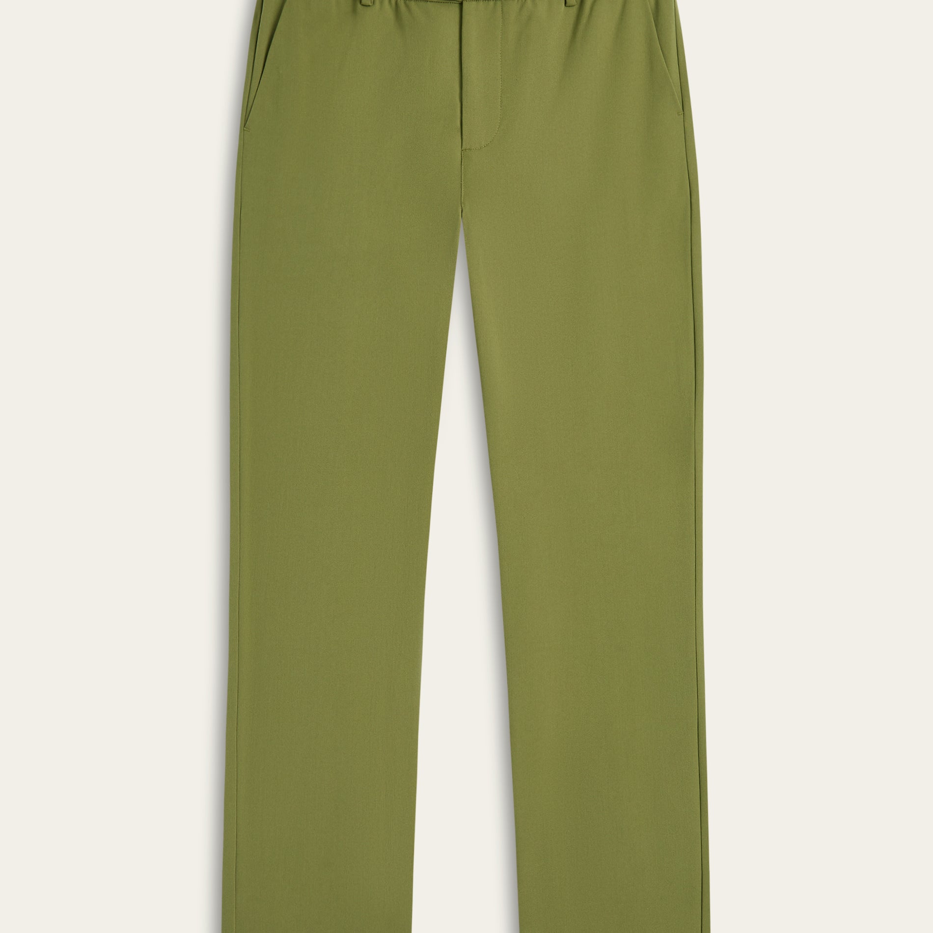 A man wearing a khaki-colored V-neck undershirt with short sleeves, paired with dark trousers.