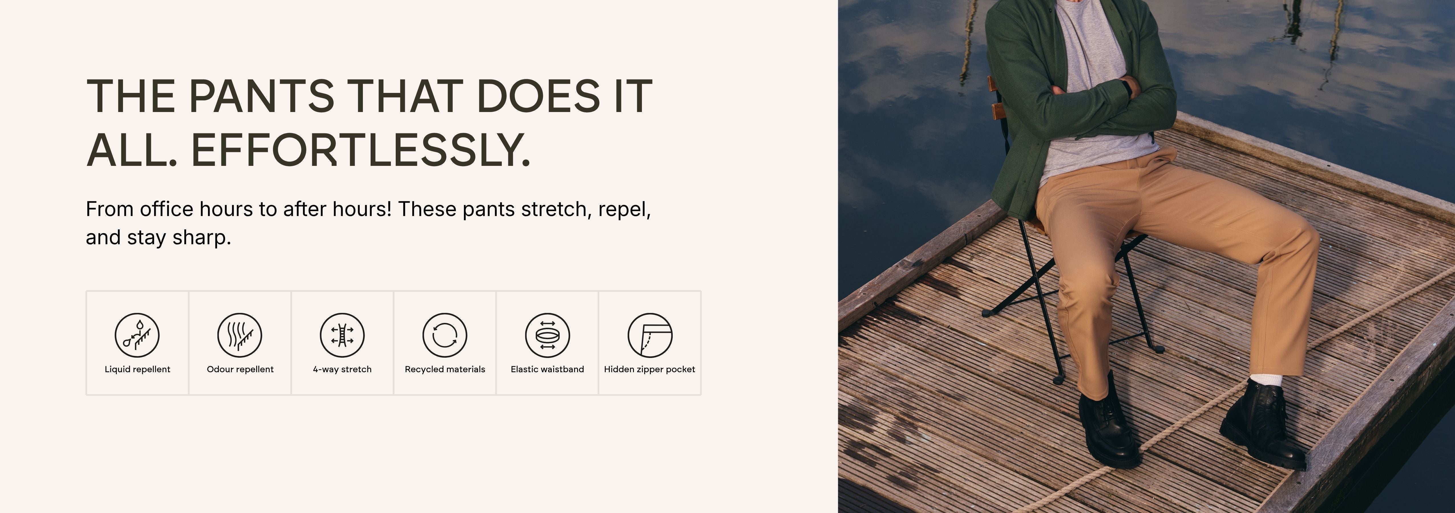 The fabric stretches in four directions. Ultimate comfort guaranteed. Features hidden zipper pockets, keeping valuables safe on the go.