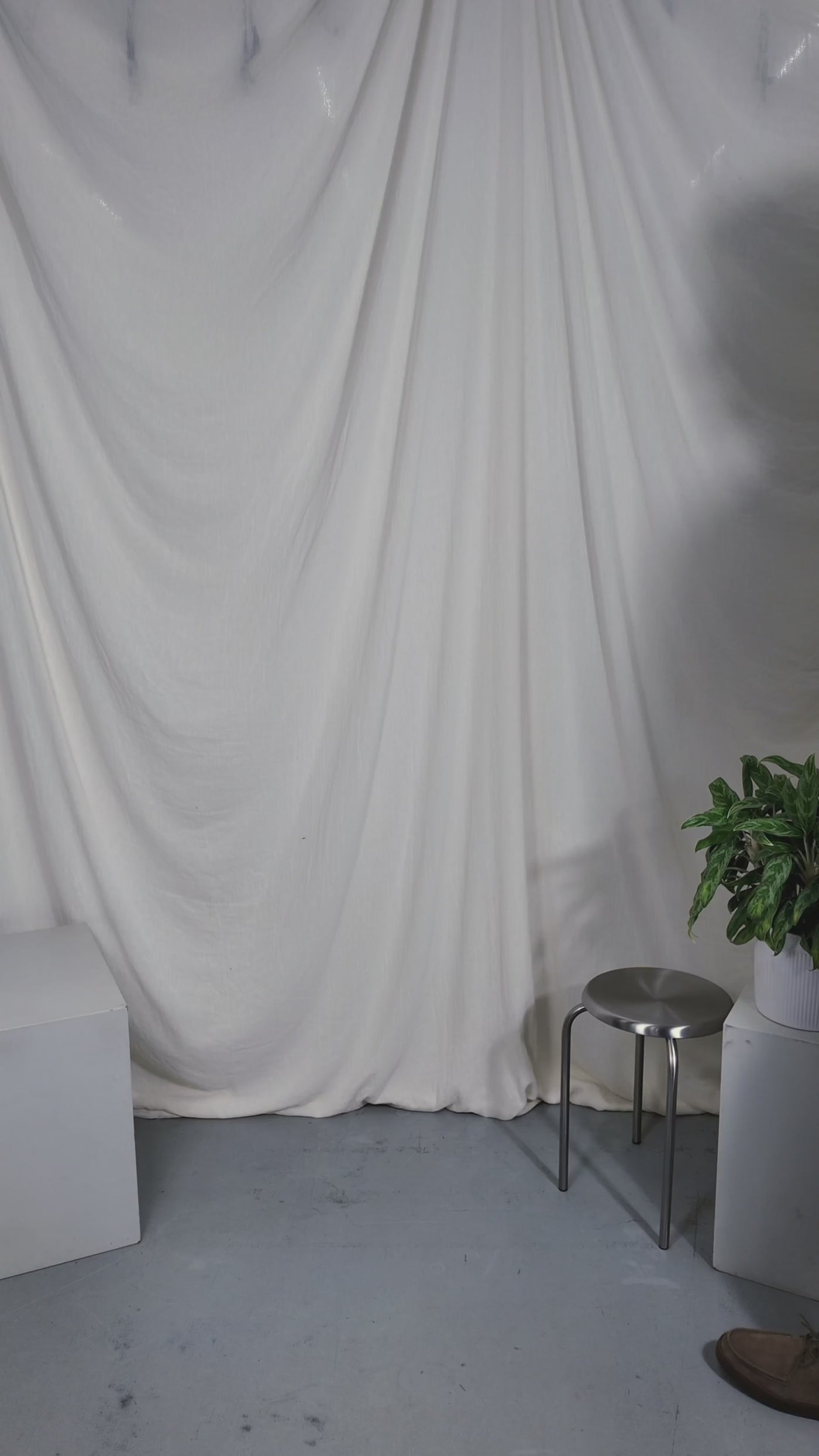 Two people sitting on a stool in a studio setting with photography equipment.
