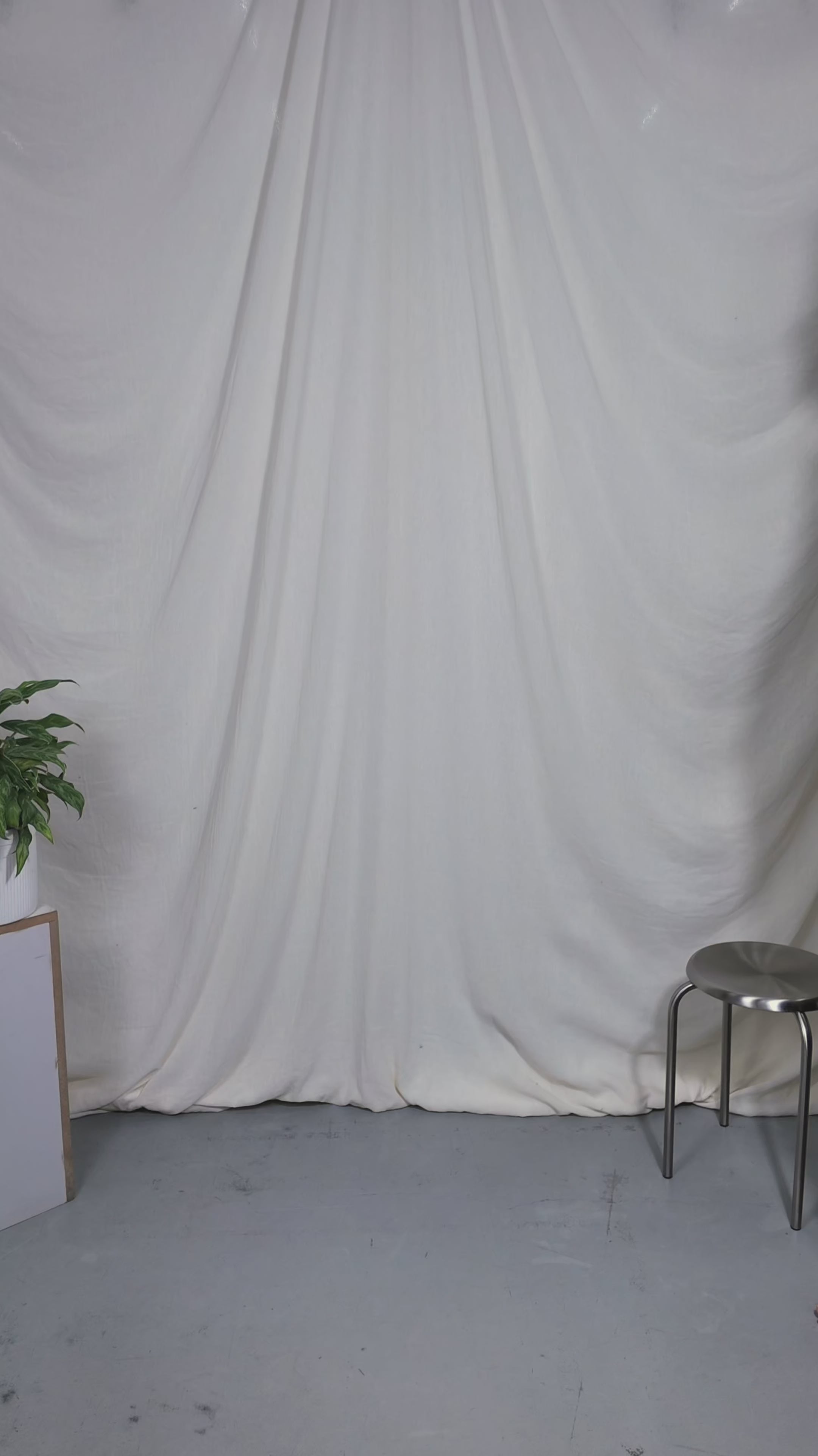 Two people sitting on a stool in a studio setting with photography equipment.