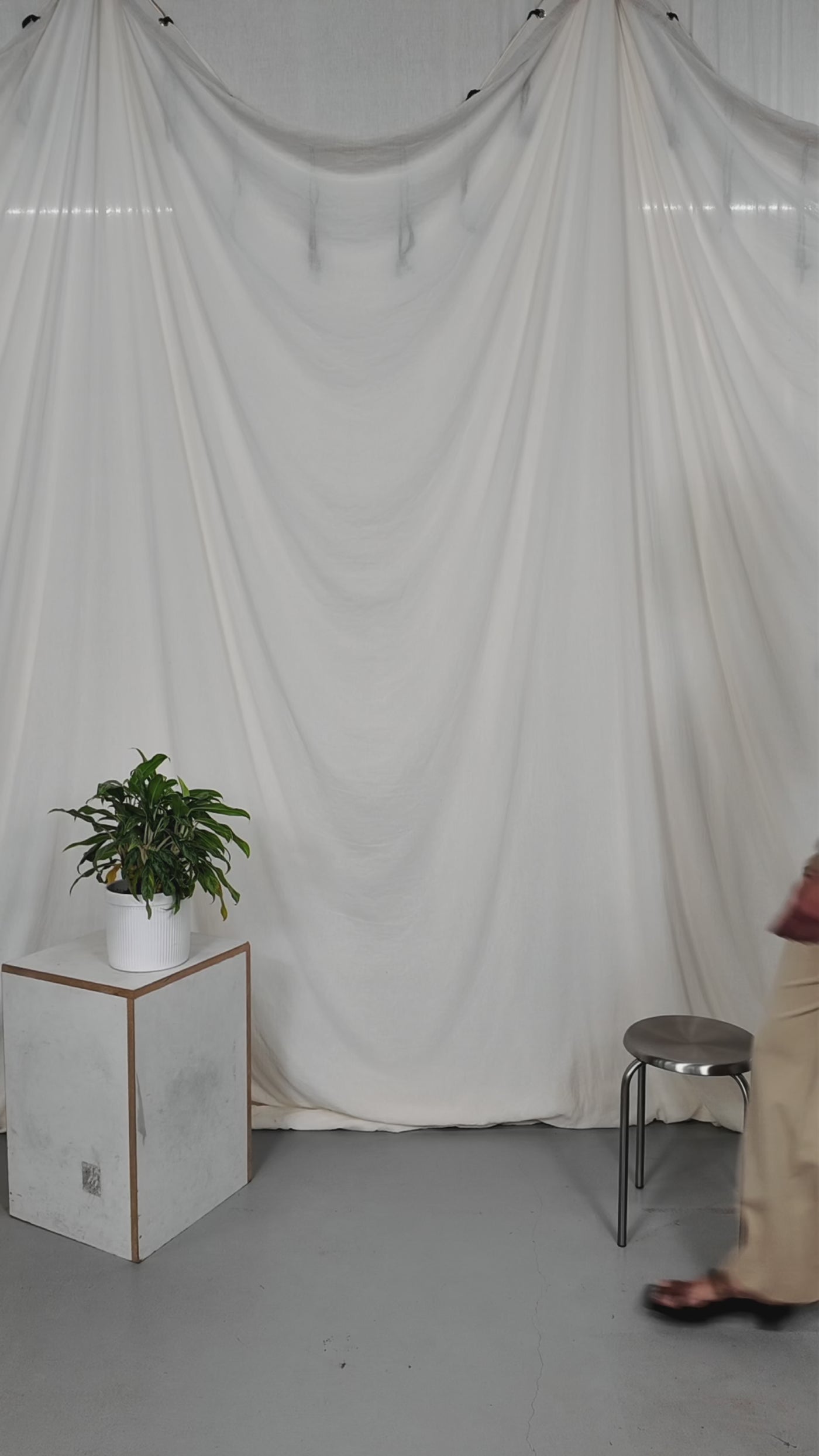 Two people sitting on a stool in a studio setting with photography equipment.